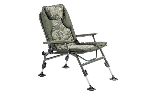 Die beiden Armlehnen sind mit Neoprenpolster bezogen und ermöglichen eine komfortable Sitzposition. Die Rückenlehne ist verstellbar in ihrer Neigung und kann an die persönliche favorisierte Sitzhaltung angepasst werden. Die ausziehbaren Beine verfügen über breite Schlammfüße und sind stufenlos über die Top Level Locks verstellbar.