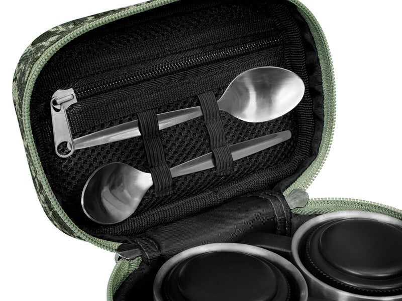 Klein in der Größe, groß im Inhalt - so ist der Delphin COTEA. Ein Produkt mit kleinen Transportmaßen, dank derer es fast keinen Platz in der Einrichtung einnimmt. Dennoch verbirgt sich dahinter ein Set, das jeden erfreuen wird, der gerne guten Kaffee oder heißen Tee am Wasser genießt. COTEA enthält zwei hochwertige Edelstahltassen, zwei Teelöffel und auch zwei verschließbare Edelstahlbehälter, die zum Beispiel für Zucker und Kaffee verwendet werden können. Der Beutel selbst hat eine kleine Netztasche, in die problemlos ein ausreichender Vorrat an Teebeuteln passt. Außerdem ist er mit hochwertigen Reißverschlüssen ausgestattet, während der äußere mit einem praktischen Halter mit Delphin-Logo versehen ist. COTEA ist in der beliebten C2G-Tarnung gestaltet und mit einem wirkungsvollen Piktogramm versehen, das die Verwendung dieses interessanten Produkts definiert.