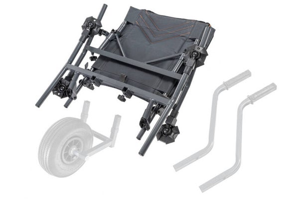 Optional kann der Stuhl mit einem speziellen Transportsystem (separat erhältlich) ausgestattet werden, das ihn in Sekundenschnelle in einen stabilen Transportwagen verwandelt – ideal, um die gesamte Ausrüstung bequem zu transportieren.