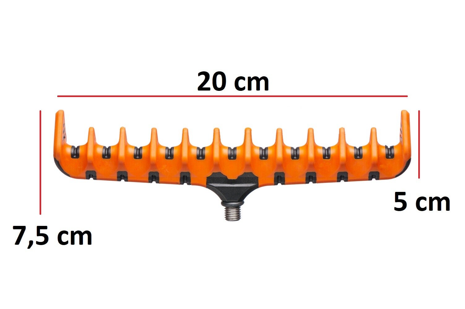 Breite vordere Rutenauflage für das Method-/Feederfischen. Die markanten Rippen halten die Rute auch bei Wind, starker Strömung oder bei scharfen Schlägen sicher in Position. Kleine Kerben in jeder Position erleichtern den einfachen Durchgang der Angelschnur. Die Konstruktion ist sehr solide und stabil. Darüber hinaus verfügt die Rutenauflage über eine SoftTouch-beschichtete Oberfläche, um die Oberfläche der Rute vor Kratzern zu schützen. Die Rutenauflage ist mit einem hochwertigen Messinggewinde ausgestattet, kompatibel mit allen gängigen Banksticks, Haltern und Armen.