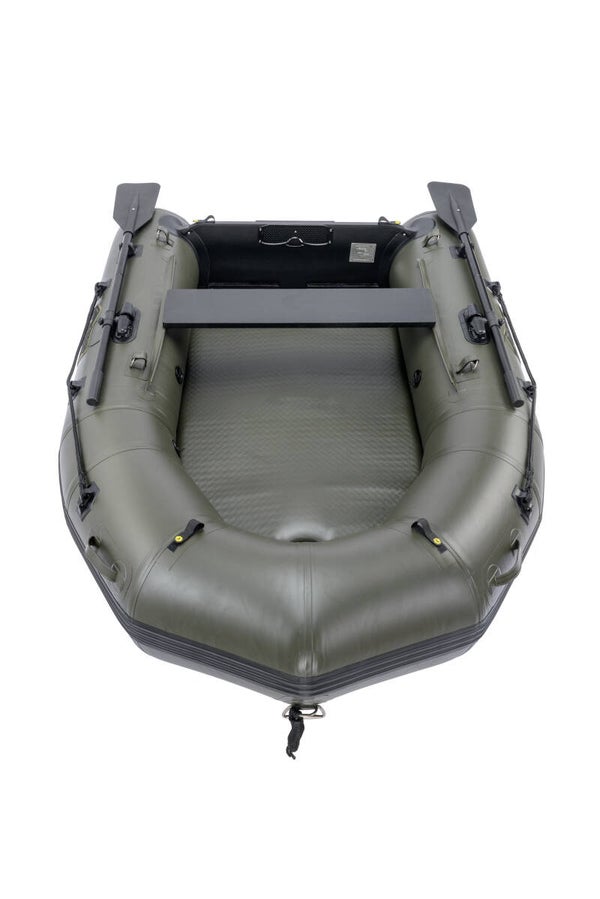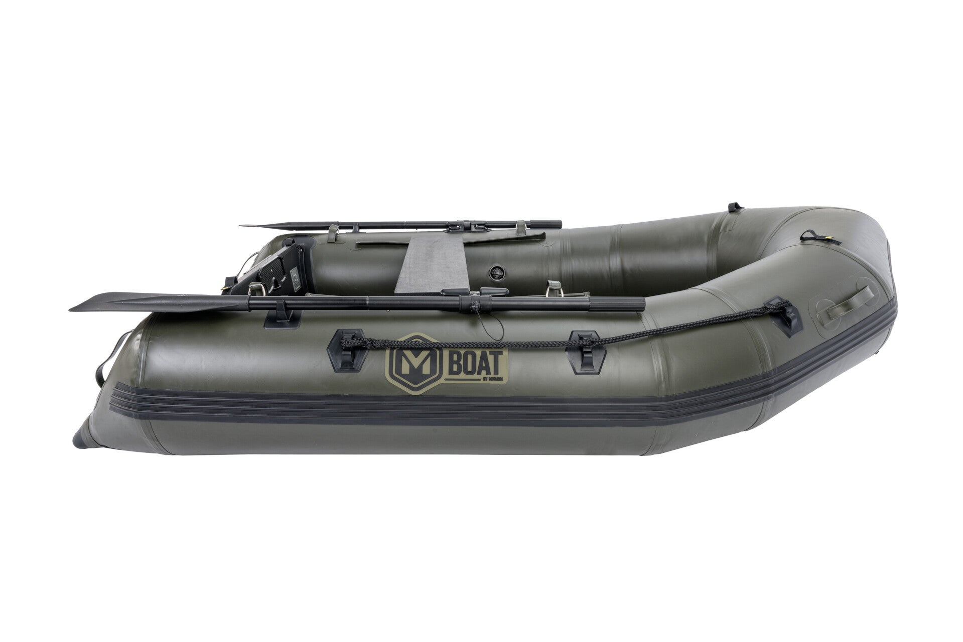 Die zweite Generation der M-BOAT AWB-Schlauchboote behält alle Vorteile und einzigartigen Merkmale dieses Modells bei und fügt gleichzeitig eine Reihe von Verbesserungen hinzu. Das Boot ist im Vorderteil und am Heck mit Klettbändern ausgestattet. Im Mittelteil befindet sich außerdem ein robuster Zubehörgurt, Haltegriffe und Ösen wurden optimiert bzw. ergänzt. Die M-Boat AWB-Serie wurde deutlich in der Ausstattung ergänzt. Das harmonische Gesamtbild wird nicht zuletzt von einem weniger auffallendem Logo vervollständigt. Der aufblasbare Boden mit doppelter Trittschicht ist nahezu unverwüstlich und harmoniert durch seine grüne Farbe gut mit der Farbgebung des Bootes sowie schwarzen Rudern und anderem Zubehör. Die überdurchschnittliche Breite und die spezifische Form des Bootes sorgen für einen großen Innenraum, der immer deutlich größer ist als bei Standardbooten gleicher Länge auf dem Markt. Dies wird durch die spezielle Gestaltung des hinteren Teils der Pontons noch verstärkt, die es ermöglicht, den Heckspiegel so nah wie möglich am Ende der Pontons zu platzieren und gleichzeitig seine Funktion zur Beibehaltung der Fahrtrichtung zu sichern. Der deutlich erhöhte Bug sorgt zusammen mit der speziell geformten Frontpartie, einem robusten, über die gesamte Länge des Bodens verlaufenden aufblasbaren Kiel und dem individuell gestalteten Heckspiegel für hervorragende hydrodynamische Eigenschaften und Richtungsstabilität. In der Praxis bedeutet dies höhere Geschwindigkeit, einfacheres Handling und geringeren Energieverbrauch beim Antrieb des Bootes. Das verstärkte Material der Pontons erhöht die Pannensicherheit. Der aufblasbare Boden mit doppelter Trittschicht ist nahezu unverwüstlich und harmoniert durch seine grüne Farbe gut mit der Farbgebung des Bootes sowie schwarzen Rudern und anderem Zubehör.